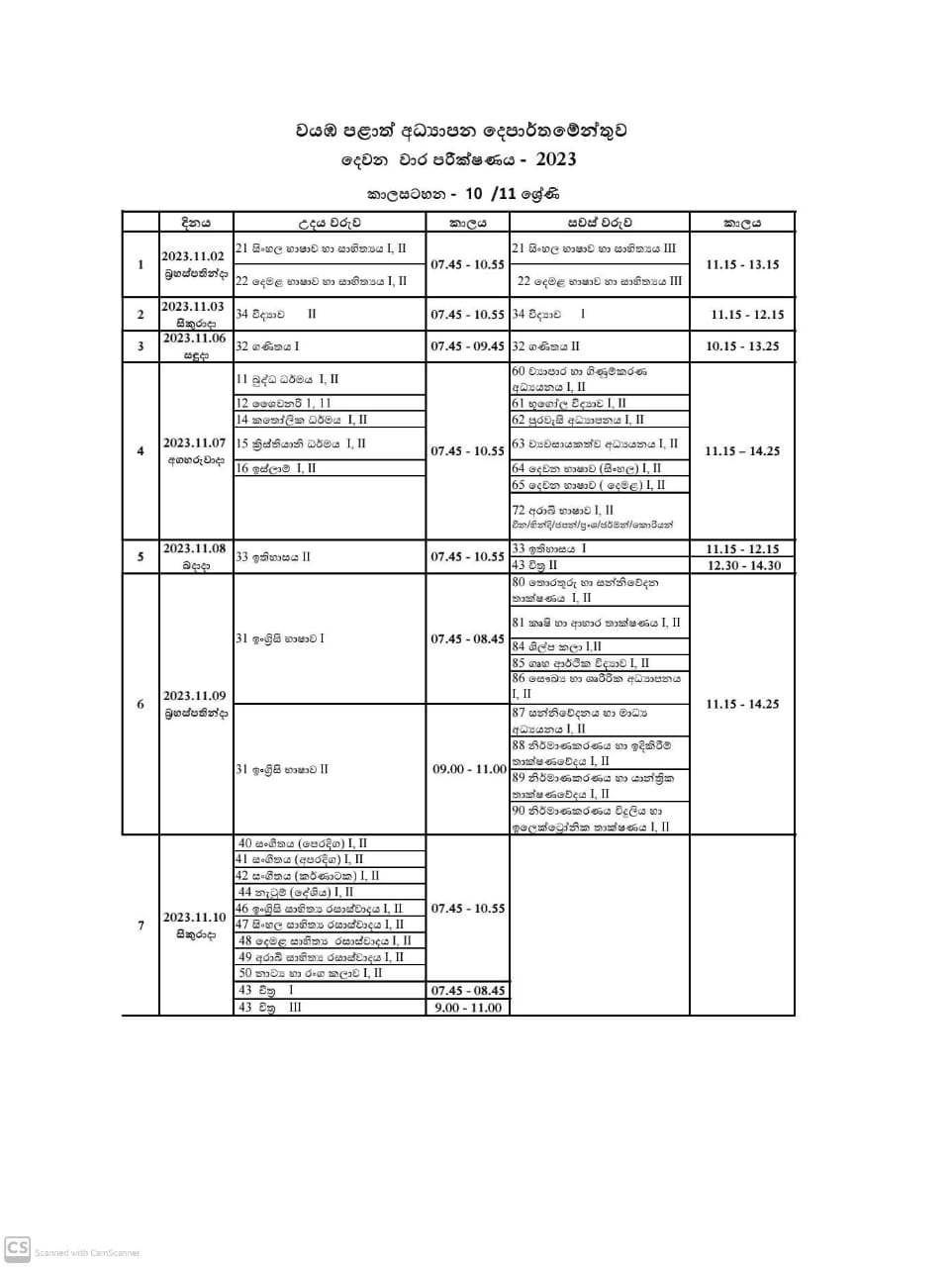 දෙවන වාර පරීක්ෂණය පැවැත්වීමට අදාළ සියලු වැඩ කටයුතු වයඹ පළාත් අධ්යාපන දෙපාර් තුමේන්තුව මගින් සම්පාදනය කර ඇති අතර 10 / 11 ශ්රේණිවල කාලසටහන පහත පරිදි වේ.